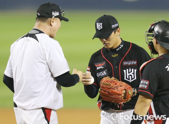 (서울=포커스뉴스) 23일 서울 잠실구장에서 열린 2016 프로야구 kt-두산 경기 6회말 2사 1,3루에서 kt 정명원 코치가 투수 교체를 위해 마운드에 올라가 주권과 주먹을 마주차며 호투를 치하하고 있다.