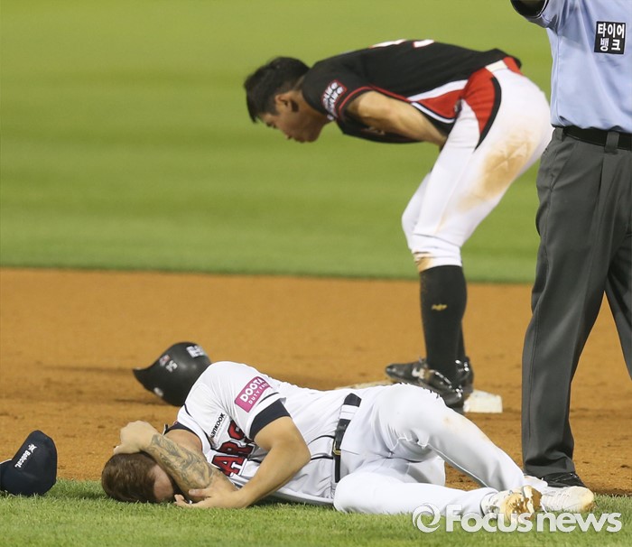 (서울=포커스뉴스) 23일 서울 잠실구장에서 열린 2016 프로야구 kt-두산 경기 8회초 2사 1,2루에서 kt 김종민의 2루 땅볼때 1루주자 전민수와 충돌한 두산 2루수 오재원이 그라운드에 쓰러져 있다.
