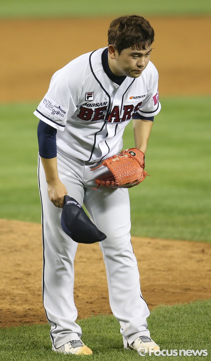 (서울=포커스뉴스) 23일 서울 잠실구장에서 열린 2016 프로야구 kt-두산 경기 8회초 2사 3루에서 두산 투수 윤명준이 kt 박경수에게 고개숙여 몸에 맞는 볼에 대해 사과의 인사를 하고 있다.