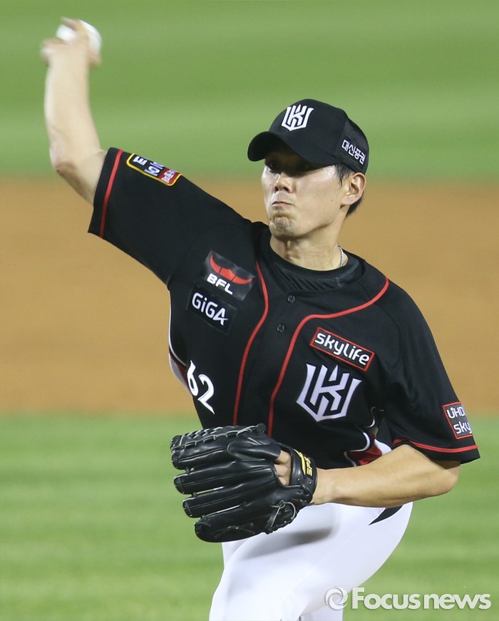 (서울=포커스뉴스) 23일 서울 잠실구장에서 열린 2016 프로야구 kt-두산 경기에서 kt 투수 김재윤이 8회말 2사 1루에서 등판해 투구하고 있다.