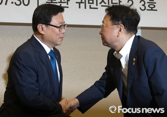 (서울=포커스뉴스) 24일 오전 서울 여의도 국회 귀빈식당에서 열린 2016년 하반기 경제정책방향 당정간담회에 참석한 유일호(오른쪽) 경제부총리 겸 기획재정부 장관과 이동필 농림축산식품부 장관이 인사하고 있다.