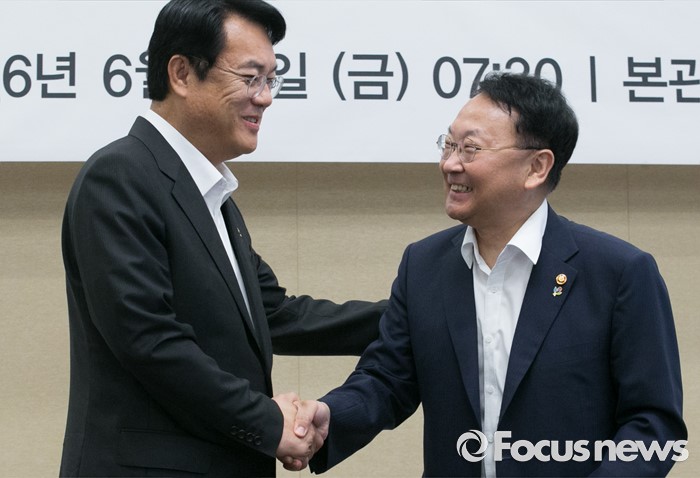 (서울=포커스뉴스) 24일 오전 서울 여의도 국회 귀빈식당에서 열린 2016년 하반기 경제정책방향 당정간담회에 참석한 정진석(왼쪽) 새누리당 원내대표와 유일호 경제부총리 겸 기획재정부 장관이 인사하고 있다.