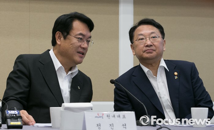 (서울=포커스뉴스) 24일 오전 서울 여의도 국회 귀빈식당에서 열린 2016년 하반기 경제정책방향 당정간담회에 참석한 정진석(왼쪽) 새누리당 원내대표와 유일호 경제부총리 겸 기획재정부 장관이 대화하고 있다.