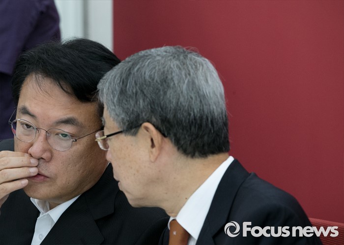 (서울=포커스뉴스) 24일 오전 서울 여의도 국회에서 열린 북한 미사일 발사 관련 국방부 현안보고에 참석한 김희옥(오른쪽) 새누리당 혁신비대위원장과 정진석 원내대표가 대화하고 있다.