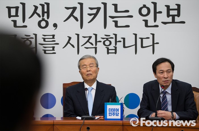 (서울=포커스뉴스) 우상호(오른쪽) 원내대표가 24일 오전 서울 여의도 국회 더불어민주당 당대표 회의실에서 열린 북한 미사일 발사 관련 국방부 현안보고 자리에서 발언하고 있다. 왼쪽은 김종인 비대위 대표.