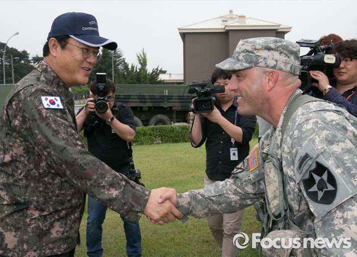 (의정부=포커스뉴스) 정진석(왼쪽) 새누리당 원내대표가 24일 오전 경기도 의정부 미2사단 한미연합사단을 방문해 아파치 헬기에 대한 설명을 듣기에 앞서 군 관계자와 인사하고 있다.