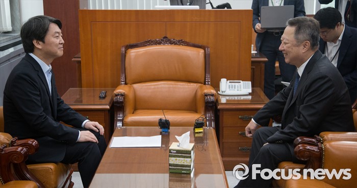 (서울=포커스뉴스) 안철수 국민의당 상임공동대표와 박용만 대한상공회의소 회장이 24일 오전 서울 여의도 국회에서 만나 대화를 나누고 있다.