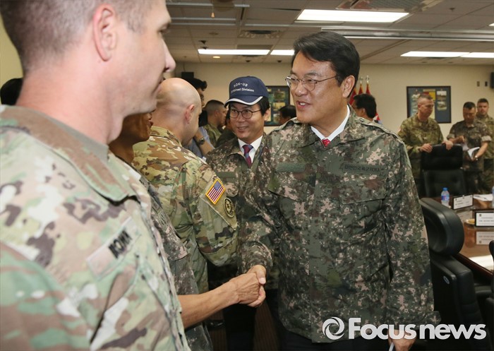 (의정부=포커스뉴스) 정진석 새누리당 원내대표, 김영우 국방위원장 등 의원들이 24일 오전 경기도 의정부 미2사단 한미연합사단을 방문해 미군 관계자들과 인사하고 있다.
