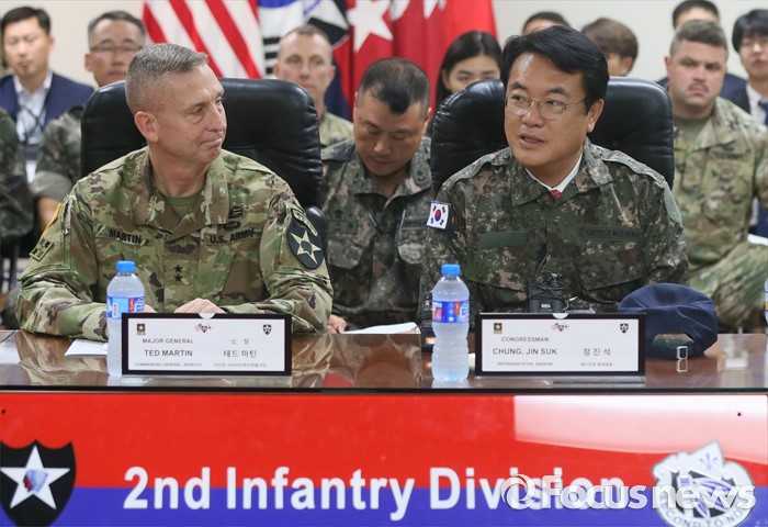 (의정부=포커스뉴스) 정진석(오른쪽) 새누리당 원내대표가 24일 오전 경기도 의정부 미2사단 한미연합사단을 방문해 부대현황 보고에 앞서 인사말을 하고 있다. 왼쪽은 테드 마틴 미2사단장.