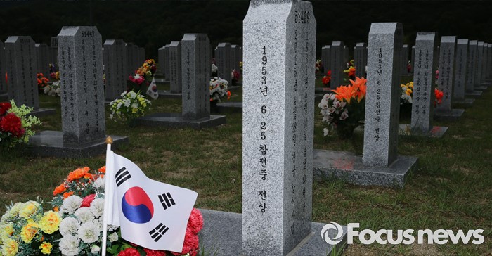 (대전=포커스뉴스) 6·25전쟁 66주년을 하루 앞둔 24일 오후 대전 유성구 국립대전현충원 6.25 전쟁 참전 용사의 묘비 앞에 태극기가 바람에 휘날리고 있다.