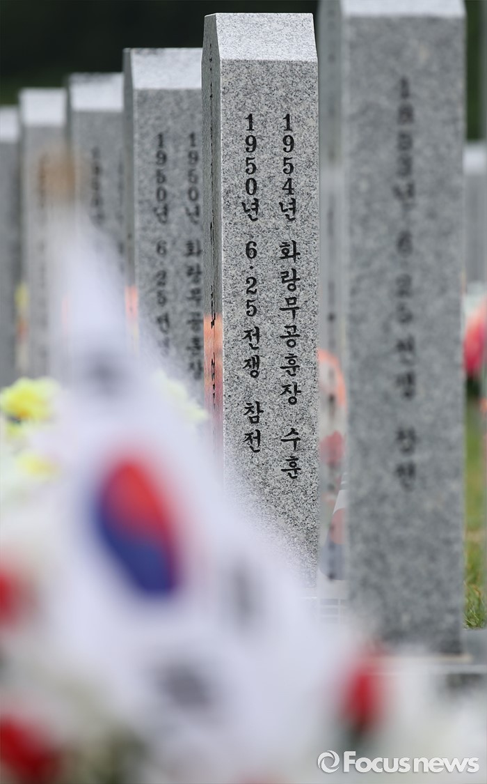 (대전=포커스뉴스) 6·25전쟁 66주년을 하루 앞둔 24일 오후 대전 유성구 국립대전현충원 6.25 전쟁 참전 용사의 묘비 앞에 태극기가 바람에 휘날리고 있다.