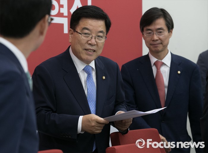 (서울=포커스뉴스) 24일 오후 서울 여의도 국회에서 열린 새누리당 브렉시트(Brexit) 관련 긴급현안 점검회의에 김광림(왼쪽) 정책위의장과 조경태 기획재정위원장이 참석하고 있다.