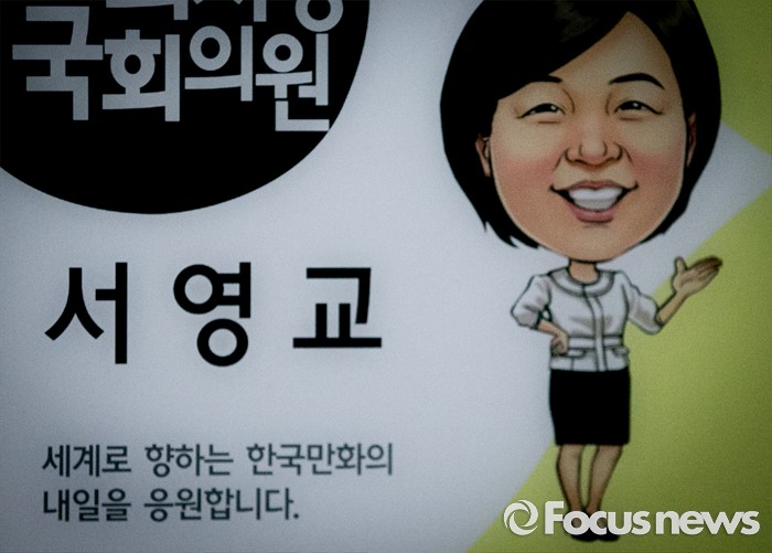 (서울=포커스뉴스) 서영교 더불어민주당 의원이 가족채용 논란 및 논문표절 의혹 등으로 법사위원직을 사퇴한 24일 오후 서울 여의도 국회 의원회관 의원실 앞에 서 의원을 표현한 만화가 걸려 있다.
