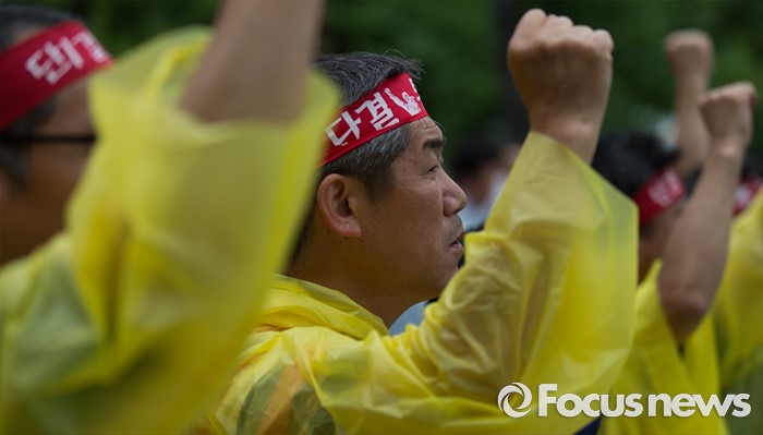 (서울=포커스뉴스) 24일 오후 서울 영등포구 산업은행 앞에서 열린 '성과급제 폐지와 노동기본권 쟁취를 위한 공무원·교사 결의대회'에 참가한 전국교직원노동조합과 전국공무원노동조합 조합원들이 구호를 외치고 있다.
