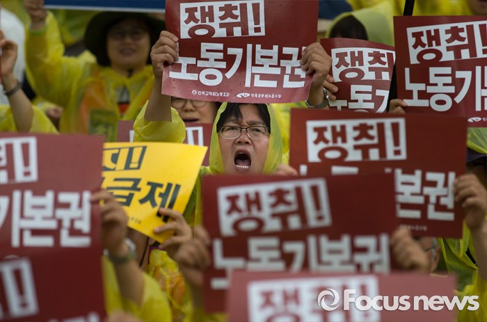 (서울=포커스뉴스) 24일 오후 서울 영등포구 산업은행 앞에서 열린 '성과급제 폐지와 노동기본권 쟁취를 위한 공무원·교사 결의대회'에 참가한 전국교직원노동조합과 전국공무원노동조합 조합원들이 손피켓을 들고 함성을 지르고 있다.