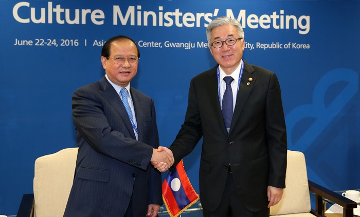 (광주=포커스뉴스) 김종덕(오른쪽) 문화체육관광부 장관이 24일 제7차 ASEM 문화장관회의가 열리고 있는 광주시 동구 국립아시아문화전당에서 보생캄 봉다라(Bosengkham Vongdara) 라오스 장관과 접견을 하고 있다. <사진제공=문화체육관광부>