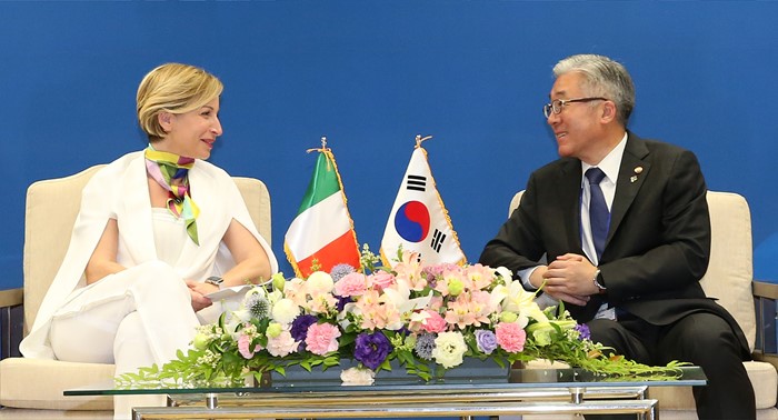 (광주=포커스뉴스) 김종덕 문화체육관광부 장관이 24일 제7차 ASEM 문화장관회의가 열리고 있는 광주시 동구 국립아시아문화전당에서 도리나 비안키(Dorina Bianchi) 이탈리아 차관과 접견을 하고 있다. <사진제공=문화체육관광부>