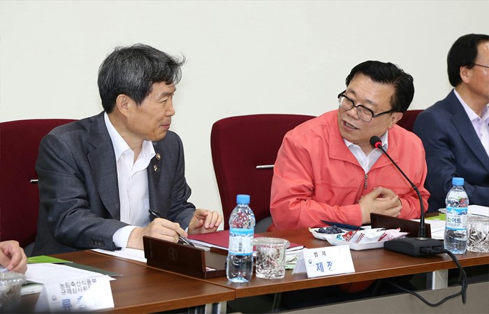 (고성=포커스뉴스) 이동필 농림축산식품부 장관이 24일 경남 고성군 농업기술센터에서 재정부 법제처장 등이 참석한 가운데 열린 규제개혁 현장포럼에 참석해 규제개혁 간담회를 진행하고 있다. <사진제공=농림축산식품부>