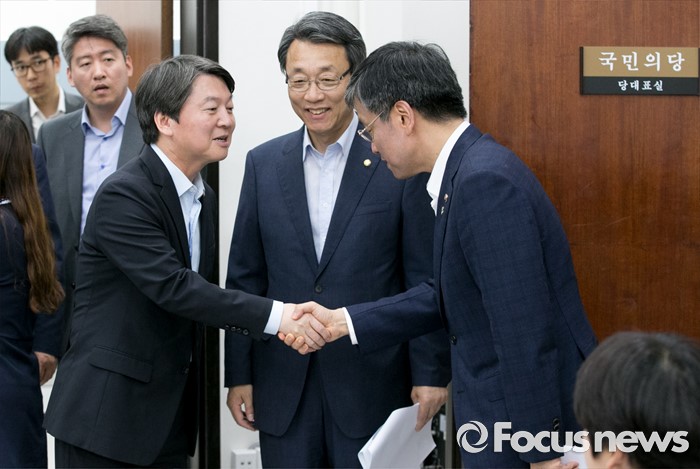 (서울=포커스뉴스) 안철수(왼쪽) 국민의당 상임공동대표가 24일 오후 서울 여의도 국회에서 열린 브렉시트(Brexit) 대책회의에 앞서 최상목(가운데) 기획재정부 1차관과 인사하고 있다. 가운데는 김성식 정책위의장.