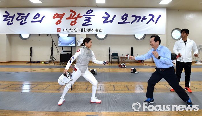 (서울=포커스뉴스) 정세균(오른쪽) 국회의장이 24일 오후 서울 노원구 태릉선수촌을 방문해 브라질 리우 올림픽을 앞두고 훈련 중인 남현희 선수와 펜싱 대결을 하고 있다.