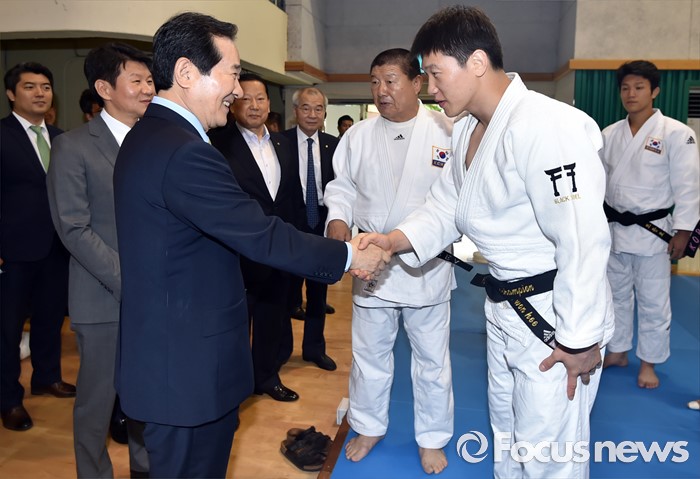 (서울=포커스뉴스) 정세균(왼쪽) 국회의장이 24일 오후 서울 노원구 태릉선수촌을 방문해 브라질 리우 올림픽을 앞두고 훈련 중인 유도 국가대표 이원희 코치와 악수하고 있다.