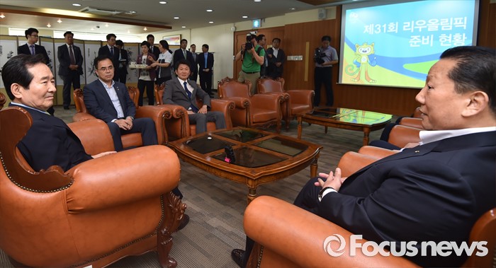 (서울=포커스뉴스) 정세균(왼쪽) 국회의장이 24일 오후 서울 노원구 태릉선수촌을 방문해 김정행 대한체육회장으로부터 브라질 리우 올림픽 준비현황을 듣고 있다.