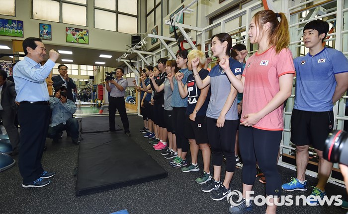 (서울=포커스뉴스) 정세균(왼쪽) 국회의장이 24일 오후 서울 노원구 태릉선수촌을 방문해 브라질 리우 올림픽을 앞두고 훈련 중인 국가대표 선수들을 만나 격려하고 있다.