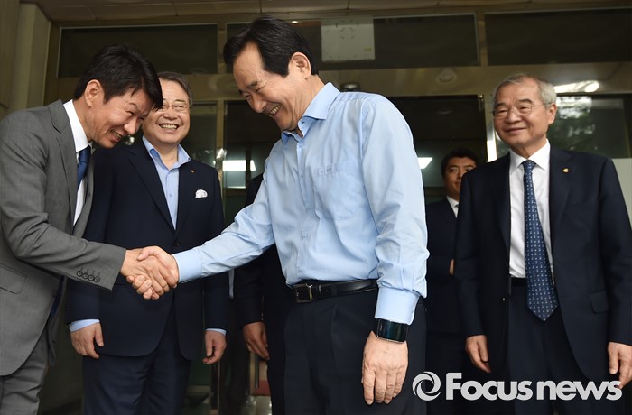 (서울=포커스뉴스) 정세균(가운데) 국회의장이 24일 오후 서울 노원구 태릉선수촌을 방문해 정몽규(왼쪽 첫번째) 브라질 리우 올림픽 선수단장과 악수하고 있다.