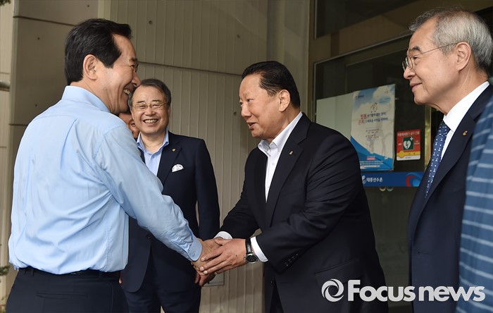 (서울=포커스뉴스) 정세균(왼쪽) 국회의장이 24일 오후 서울 노원구 태릉선수촌을 방문해 김정행(오른쪽 두번째) 대한체육회장 등 올림픽 준비위원회 관계자들과 인사하고 있다.