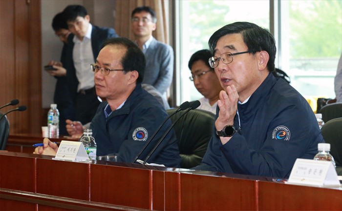 (거제=포커스뉴스) 이기권 고용노동부 장관이 24일 경남 거제 삼성중공업 노사와 간담회를 갖고 업황 부진으로 어려움을 겪는 조선업 종사자 의견을 청취하고 있다. <사진제공=고용노동부>