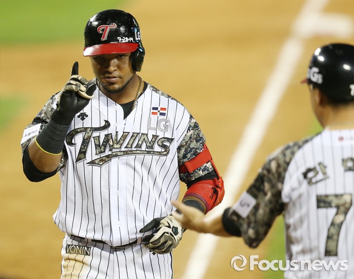 (서울=포커스뉴스) 24일 서울 잠실구장에서 열린 2016 프로야구 넥센-LG 경기 5회말 LG 히메네스가 좌중월 솔로 홈런을 치고 한혁수 코치의 환영을 받으며 홈인하고 있다.