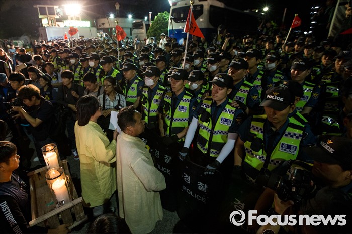 (서울=포커스뉴스) 24일 오후 서울 서초구 현대자동차 본사 앞에서 열린 '유성기업 故 한광호씨 100일ㆍ현대차 진격의 날' 집회에 참석한 고인의 형 국석호씨가 영정을 들고 경찰과 대치하고 있다.