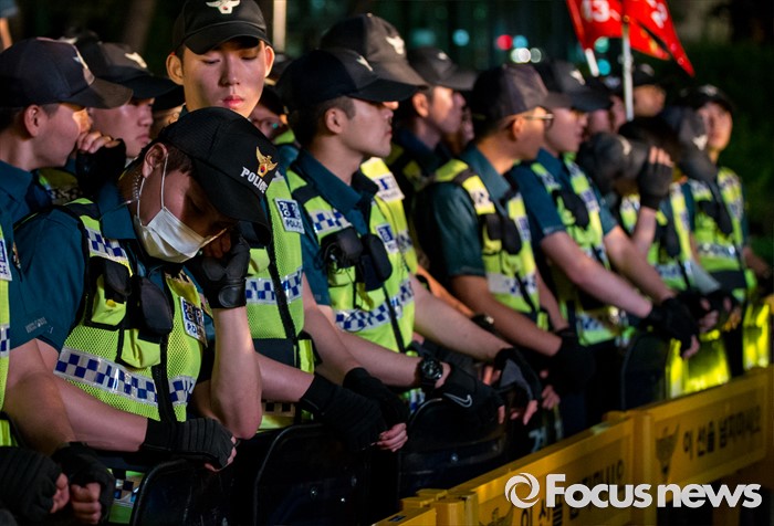 (서울=포커스뉴스) 24일 오후 서울 서초구 현대자동차 본사 앞에서 열린 '유성기업 故 한광호씨 100일ㆍ현대차 진격의 날' 집회에 대기중인 한 경찰이 졸고 있다.