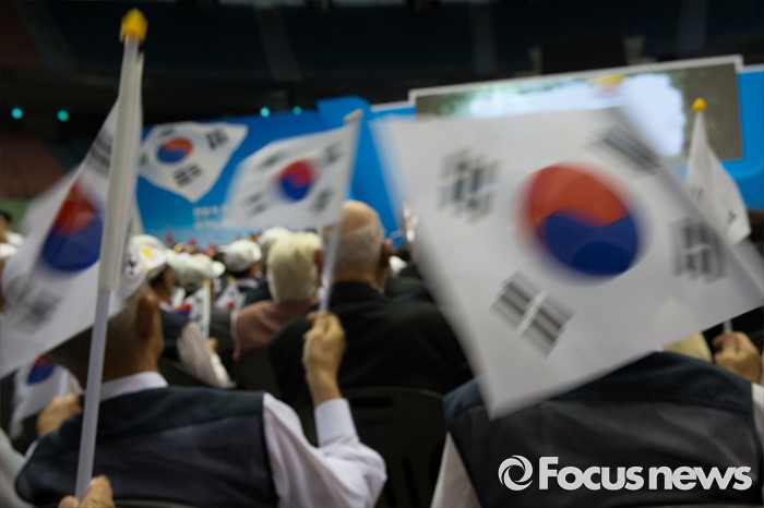 (서울=포커스뉴스) 25일 오전 서울 송파구 잠실실내체육관에서 열린 '6.25전쟁 66주년 기념식'에 참석한 참전용사 및 시민들이 태극기를 흔들고 있다.