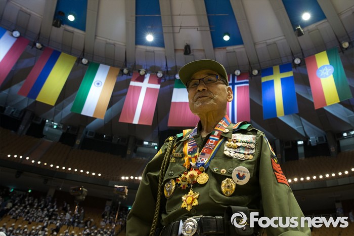 (서울=포커스뉴스) 25일 오전 서울 송파구 잠실실내체육관에서 열린 '6.25전쟁 66주년 기념식'에 참석한 참전용사가 기념식장을 빠져나가고 있다.
