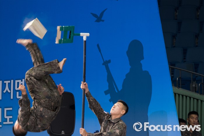(서울=포커스뉴스) 25일 오전 서울 송파구 잠실실내체육관에서 열린 '6.25전쟁 66주년 기념식'에 참석한 국군 태권도 시범단이 격파 시범을 보이고 있다.