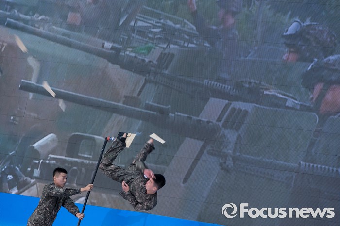 (서울=포커스뉴스) 25일 오전 서울 송파구 잠실실내체육관에서 열린 '6.25전쟁 66주년 기념식'에 참석한 국군 태권도 시범단이 격파 시범을 보이고 있다.