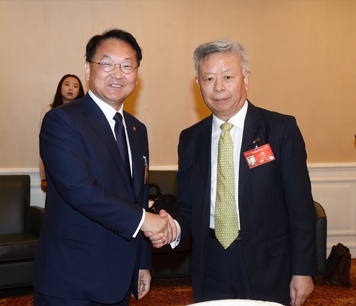 (서울=포커스뉴스) 제1차 아시아인프라개발은행(AIIB) 연차총회 참석차 중국 북경을 방문중인 유일호 부총리 겸 기획재정부 장관이 25일 월드호텔에서 진리 췬 AIIB 총재와 면담에 앞서 악수하며 인사를 나누고 있다. <사진제공=기획재정부>