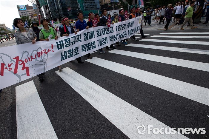 (서울=포커스뉴스) 25일 오후 서울 중구 시청광장에서 열린 '민주노총 전국노동자대회' 참석자들이 최저임금 1만원, 비정규직 철폐를 촉구하며 행진하고 있다.