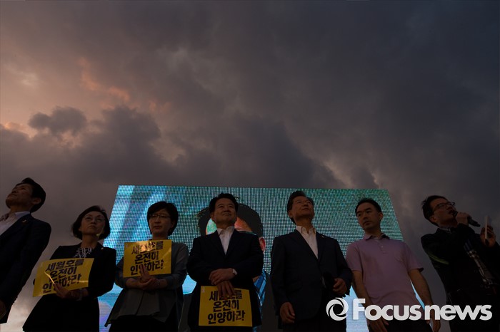 (서울=포커스뉴스) 25일 오후 서울 종로구 광화문광장에서 열린 '세월호 특별법 개정 촉구 범국민문화제'에 야당의원들이 참석하고 있다. 왼쪽부터 정의당 윤소하 의원, 국민의당 장정숙·박주현·정동영 의원, 천정배 공동대표, 채이배 의원, 더불어민주당 박주민 의원.