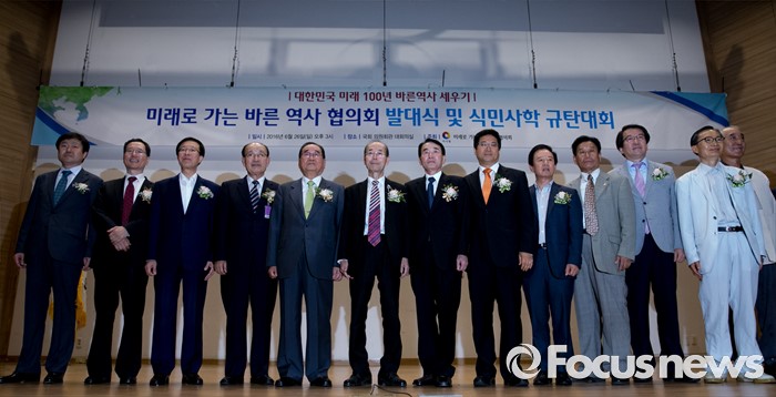 (서울=포커스뉴스) 26일 오후 서울 여의도 국회 의원회관에서 열린 미래로 가는 바른 역사 협의회 발대식 및 식민사학 규탄대회에 참석한 허성관 상임대표(전 행정자치부 장관), 이종찬 전 국정원장 등 내빈들이 기념촬영을 하고 있다.