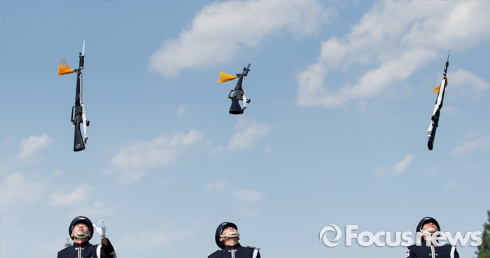 (서울=포커스뉴스) 26일 오후 서울 동작구 국립서울현충원 겨레얼마당에서 국방부 군악대와 의장대가 호국보훈의 달을 맞아 전통의장 및 퍼레이드 시범을 선보이고 있다.