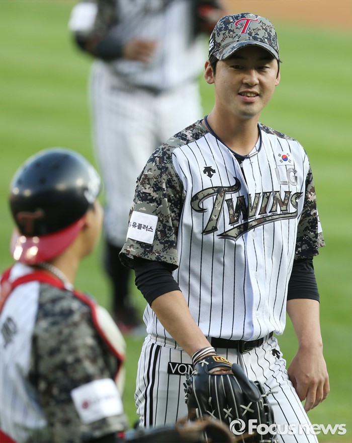 (서울=포커스뉴스) 26일 서울 잠실구장에서 열린 2016 프로야구 넥센-LG 경기 8회초 2사 2루에서 구원 등판한 LG 투수 진해수가 넥센 대타 대니 돈을 삼진아웃 시키고 밝은 표정으로 포수 박재욱과덕아웃으로 향하고 있다.