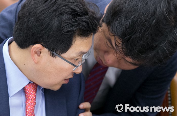 (서울=포커스뉴스) 27일 오전 서울 여의도 국회에서 열린 정무위원회 전체회의에 참석한 유의동(오른쪽) 새누리당 간사와 당권 도전을 선언한 김용태 의원이 대화하고 있다.