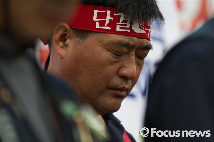 (서울=포커스뉴스) 27일 오전 서울 종로구 정부서울청사 앞에서 열린 7.6 총파업 총력투쟁 기자회견에서 전국건설노동조합 조합원이 민중의례를 하고 있다.