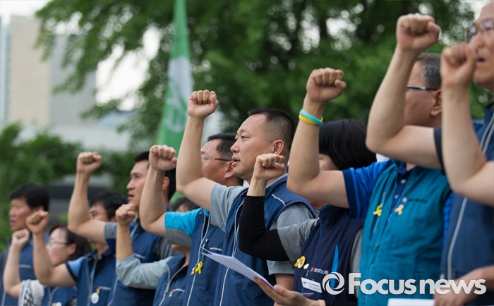 (서울=포커스뉴스) 전국공무원노동조합 조합원들이 27일 오전 서울 종로구 정부서울청사 앞에서 지도부 단식농성 투쟁 기자회견 중 성과퇴출제 폐지, 공무원법 개악 저지를 촉구하는 구호를 외치고 있다.