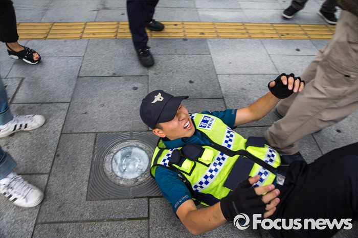 (서울=포커스뉴스) 27일 오후 서울 종로구 정부서울청사 앞에서 세월호 관련 기자회견을 앞두고 있는 시민들과 경찰들간의 몸싸움이 발생, 한 경찰이 바닥에 넘어져 있다.