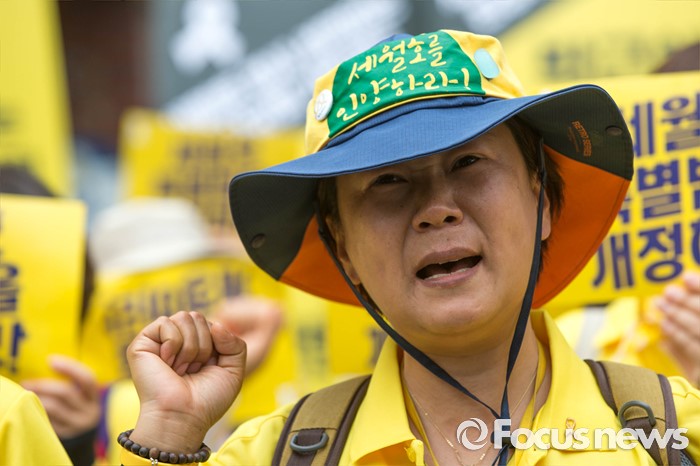(서울=포커스뉴스) 27일 오후 서울 종로구 청운효자동주민센터 앞에서 416 가족협의회와 416 연대 관계자들이 세월호 특조위 강제해산과 박근혜 정부를 규탄하는 기자회견을 하고 있다.