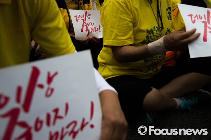 (서울=포커스뉴스) 27일 오후 서울 종로구 청운효자동주민센터 앞에서 416 가족협의회와 416 연대 관계자들이 세월호 특조위 강제해산과 박근혜 정부를 규탄하는 기자회견을 하고 있다.