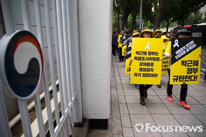(서울=포커스뉴스) 27일 오후 서울 종로구 정부서울청사 앞에 세월호 관계자들이 세월호 특별법 개정 및 선체 인양을 촉구하는 기자회견을 하기 위해 청운동주민센터 앞으로 이동하고 있다.